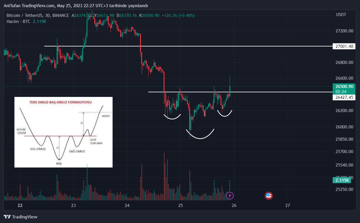 Son dakikalarda yaşanan yükselişler ile birlikte TOBO formasyonunun kritik direnç seviyesi 26.427 doları aşmayı başaran BTC, bu seviyenin üzerinde kaldığı sürece ilerleyen saatlerde 27 bin dolara ulaşabilir.