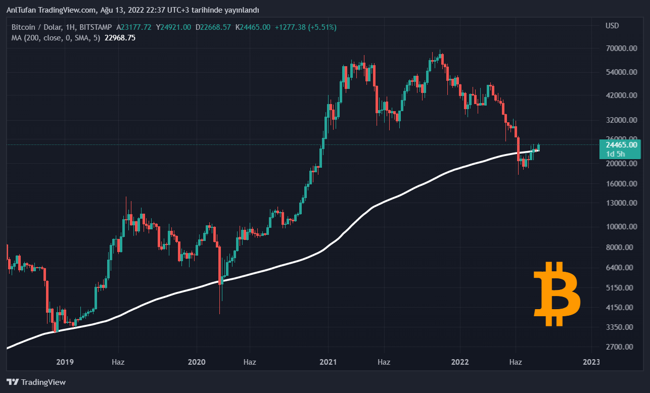 200 haftalık hareketli ortalamanın altında akümüle olmasının ardından bu çizginin üzerine çıkmayı başaran BTC, yarın gece TSİ 03.00’da 22.800 doların altına sarkmadığı takdirde 200 haftalık hareketli ortalamanın üzerinde bir haftalık kapanış daha gerçekleştirecek.