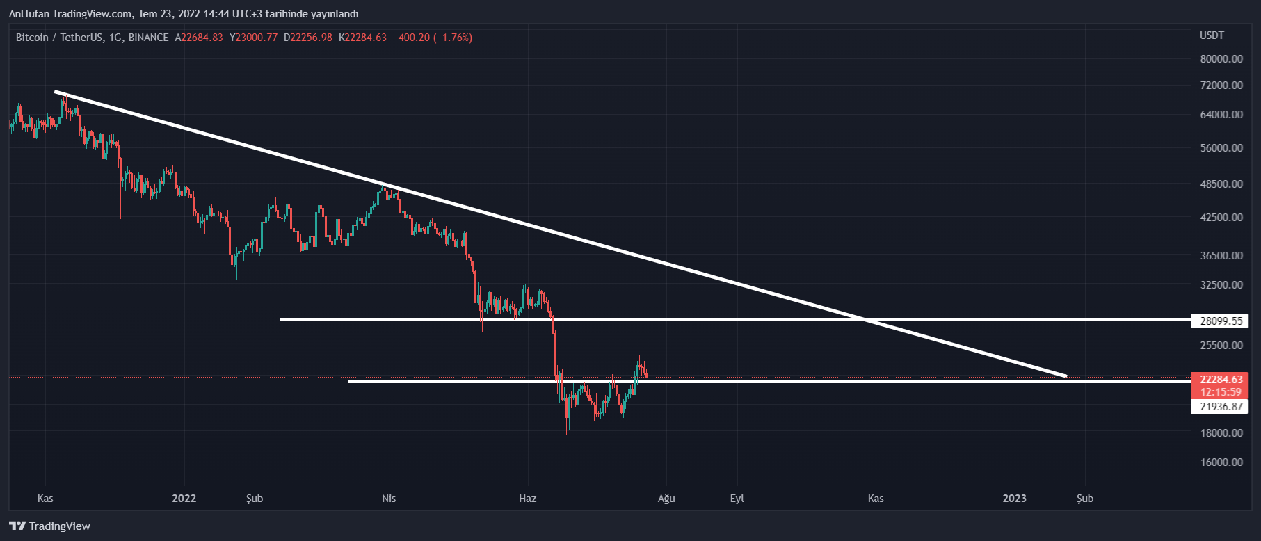 Bitcoin yaşanan bu düşüşler sonrası kritik bir destek bölgesine ulaşmış durumda. Halen 200 haftalık hareketli ortalama olan 22.700 doların üzerinde haftalık kapanış yapamayan BTC, yarın itibariyle bir yükseliş gerçekleştirebilir.