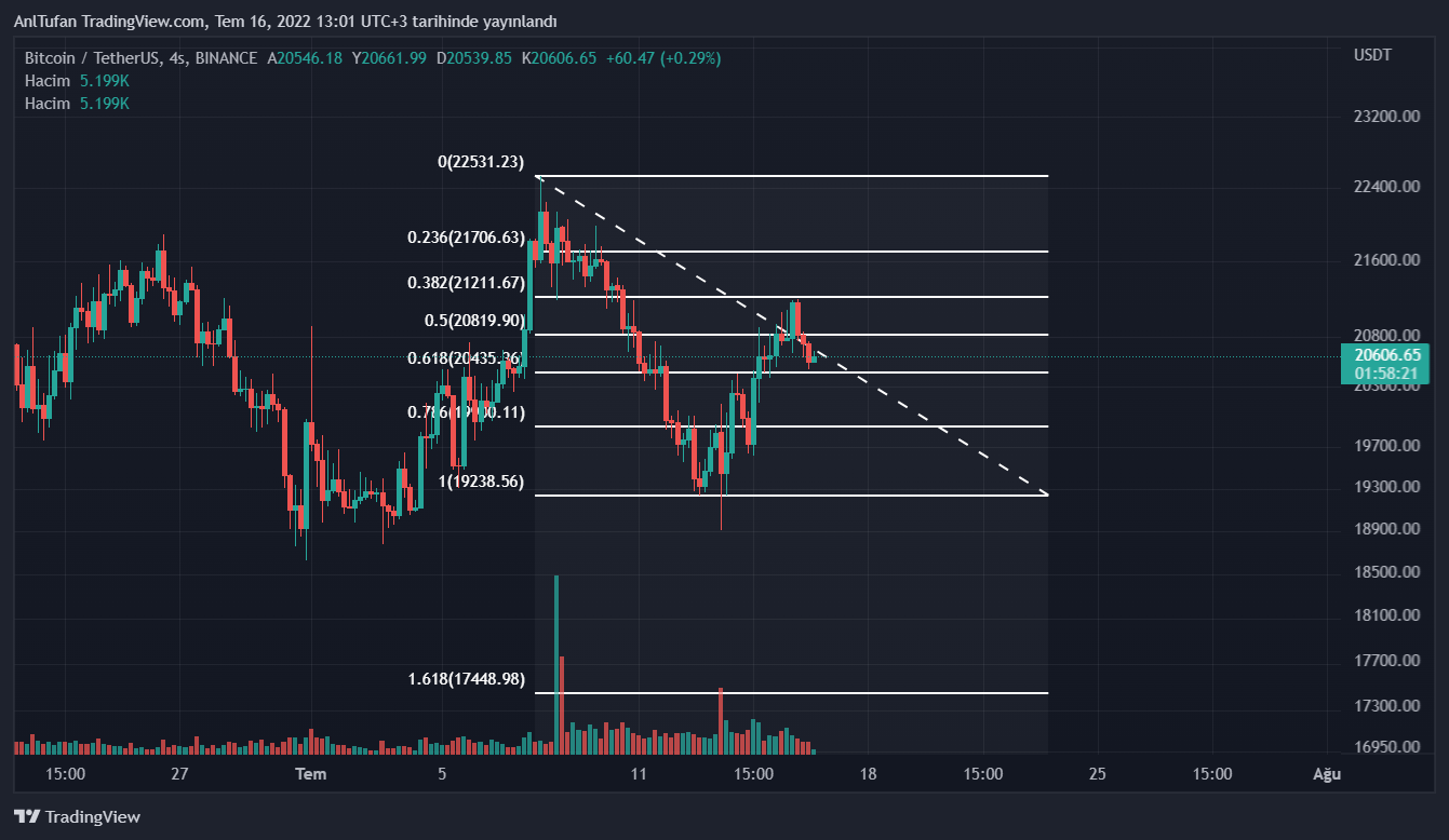 22.500 dolar seviyelerinden yaşadığı düşüşün ardından Fibonacci düzeltmesine göre 0.382 seviyesi olan 21.200 dolara kadar yükseldiği görülen BTC, bu düşüşün düzeltmesini tamamlamış olabilir.