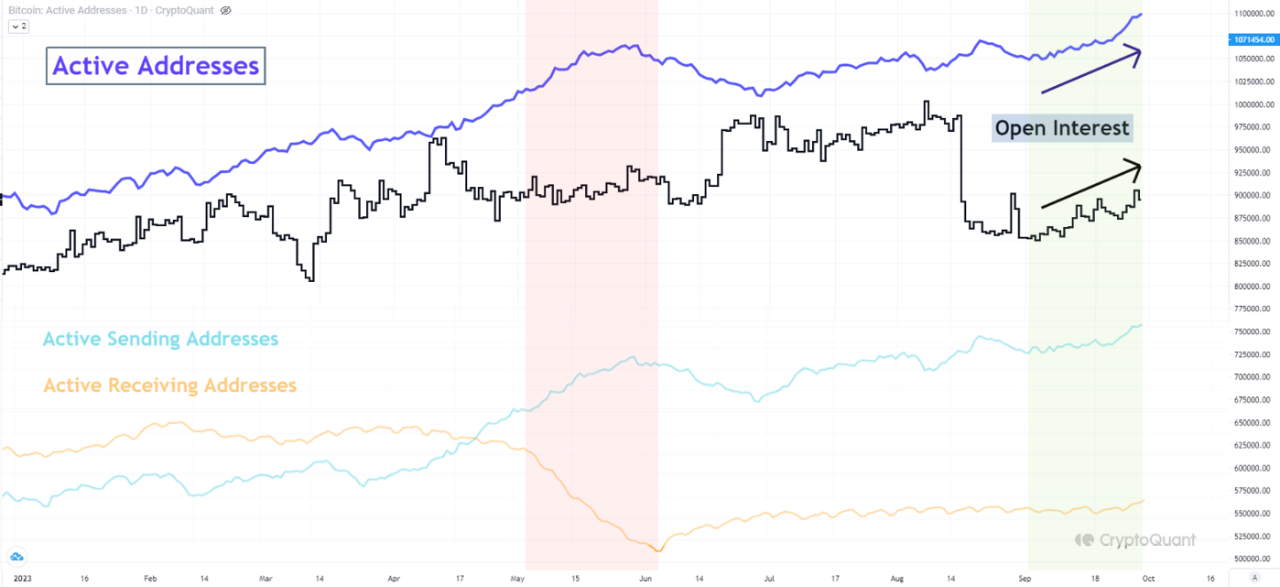 Son zamanlarda, Aktif Adresler Eylül başından bu yana kademeli bir artış eğilimindedir. BTC fiyatı yatay hareket etse de Açık Pozisyon de artıyor, bu da piyasa talebinin giderek arttığı anlamına geliyor, bu olumlu bir durum.”