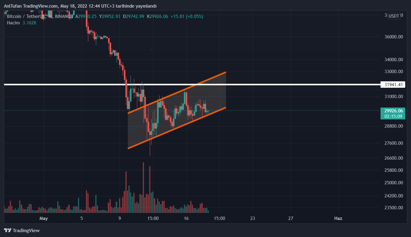 Kanalın alt trendini kaybetmediği sürece yükseliş yaşayacak olan lider kripto para birimi, 29.500 doları aşağı yönlü kırması durumunda ise satıcı baskısının artığına şahit olabiliriz.
