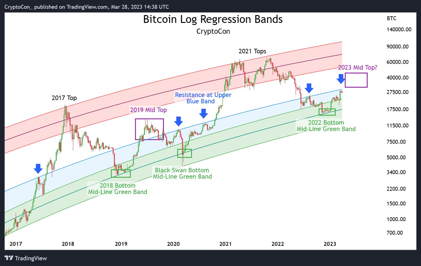 “Geçen döngüde olduğu gibi bitcoin yine Aralık 2022’de 15.800 dolar seviyelerinde Log Regresyon Bantlarının yeşil orta çizgisinde dibe vurdu.”