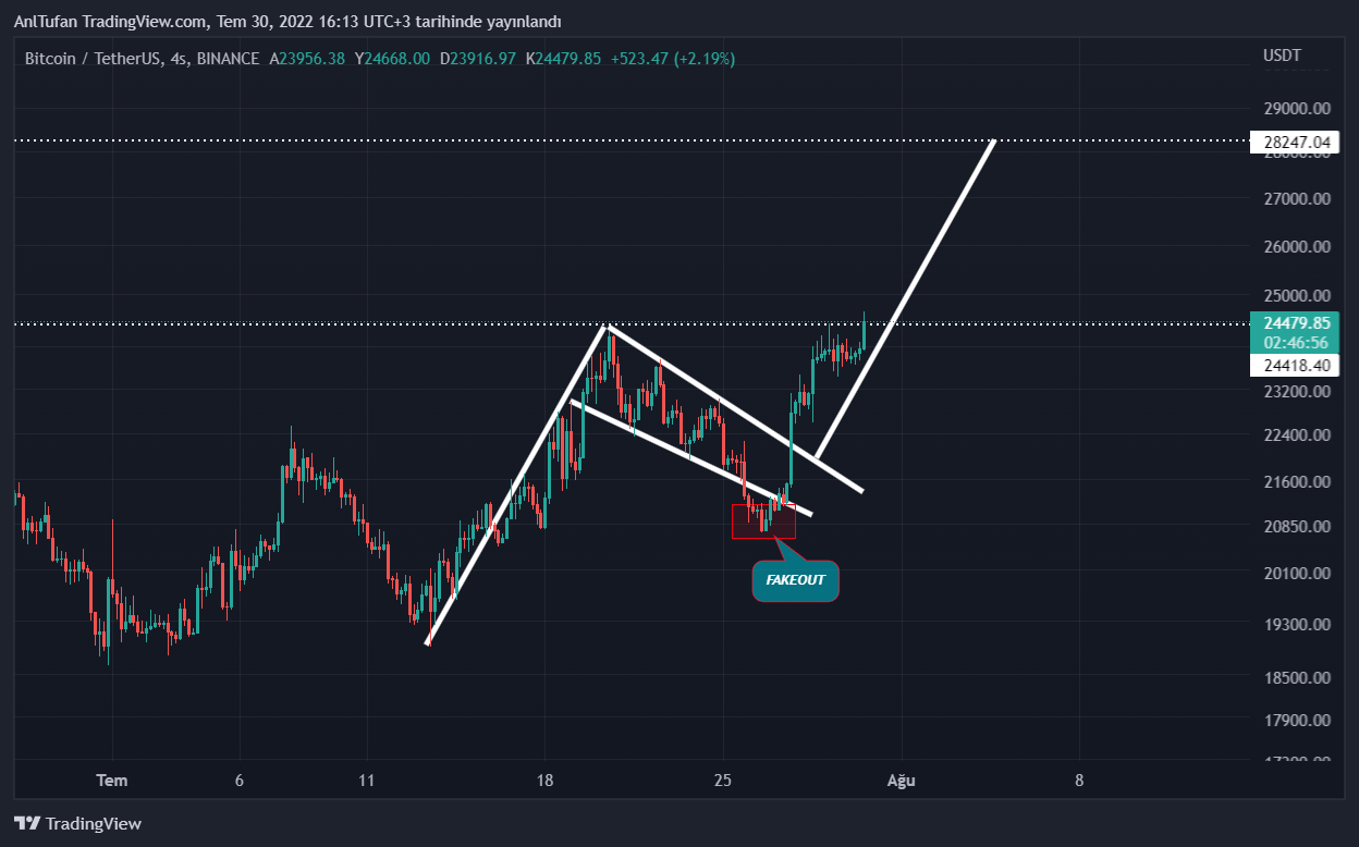 Geçtiğimiz dönemlerde Bitcoin‘in boğa bayrağı formasyonu oluşturduğunu siz okurlarımıza aktarmıştık. Amerikan Merkez Bankasının (FED) kararları nedeniyle bir fakeout gerçekleştiren BTC, hedefine yürümeye devam ediyor.