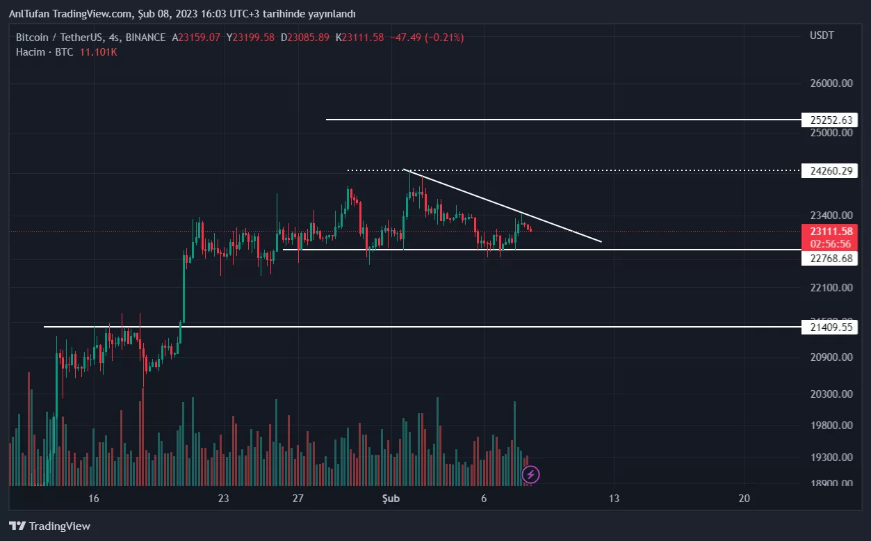 Yeni yükseliş hareketleri için ise düşen trend noktası takip edilmeli. Şuan itibariyle 23.400 dolar seviyelerinde yer alan düşen trendin kırılması, BTC’nin son zirvesi olan 24.250 dolara yükselmesini sağlayacaktır.