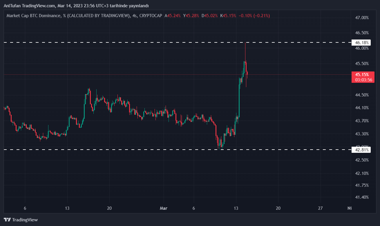 Yüzde 42.80 seviyelerinden yüzde 46.18 seviyelerine kadar yükseliş yaşayan BTC dominans tablosu, şuan itibariyle ise yüzde 45.17 seviyelerinde konumlanıyor.