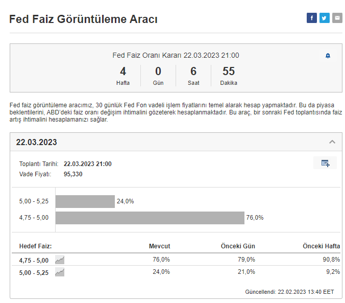 Amerikan Merkez Bankası (FED) yeni faiz artış kararını 22 Mart tarihinde açıklayacak. Şuan itibariyle faiz artış beklentilerine baktığımızda, 25 baz puanın ağırlık bastığı görülebiliyor.