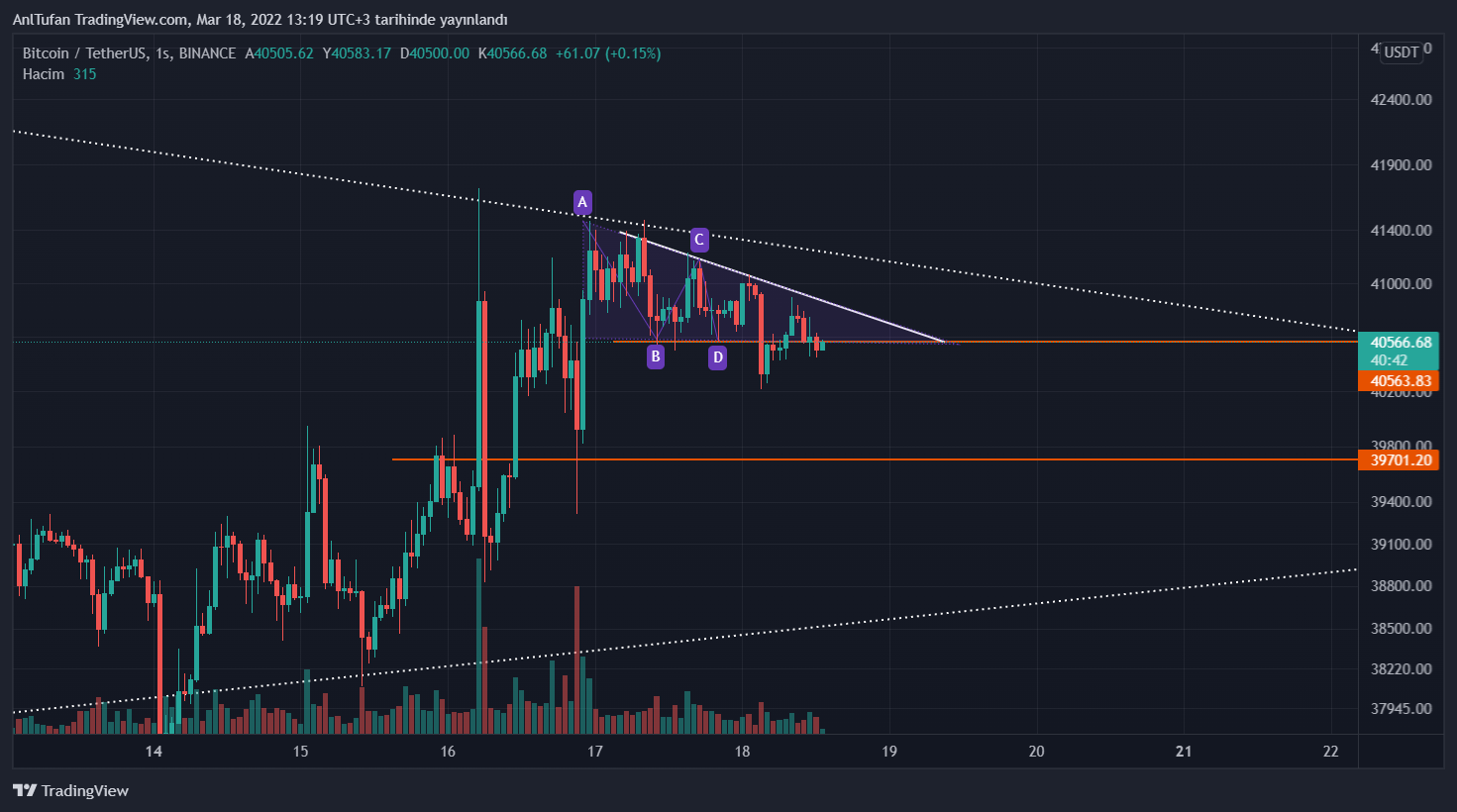 Yayın saati itibariyle 40.560 dolar seviyelerinde buluna Bitcoin, dün gece itibariyle oluşturduğu alçalan üçgenin altında bulunuyor.