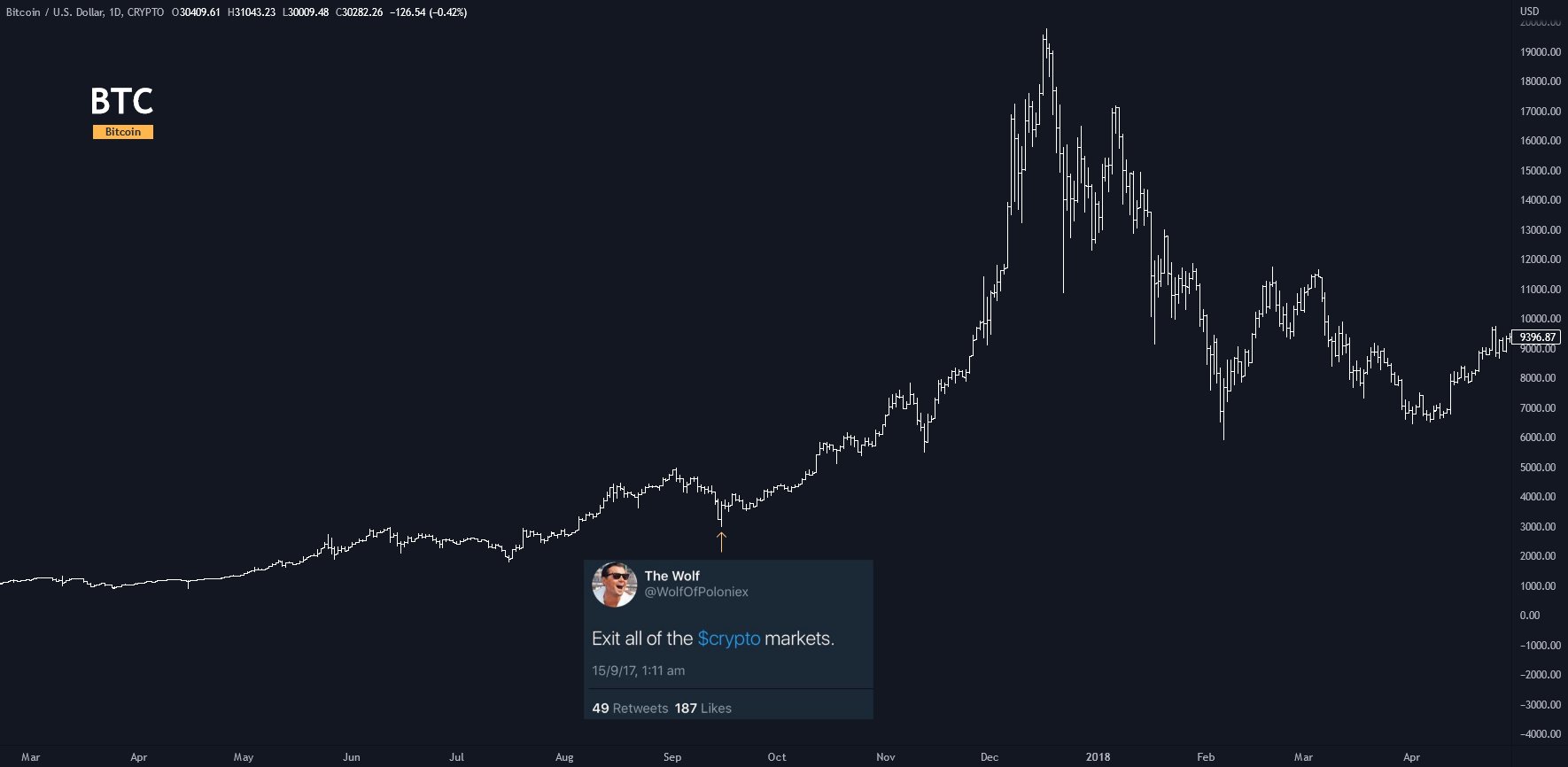 15 Eylül 2017 tarihinde “tüm kripto pazarlarından çıkın” şeklinde bir tweet atan The Wolf, bu tweet’inin ardından yaşanan devasa BTC ve altcoin rallisinin resmen maskotlarından bir tanesi haline geldi.