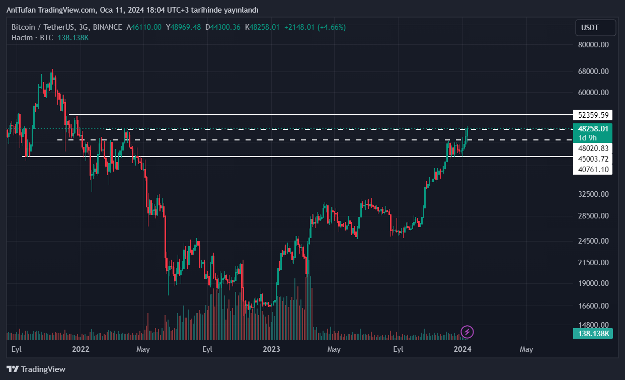 Şuan itibariyle büyük tabloyu incelediğimizde, Bitcoin’in 48 bin dolar direncinin üzerinde yer aldığı görülüyor. Geçtiğimiz süreçte 40 bin dolardan destek bulan BTC, 45 bin ve 48 bin dolar dirençlerini aşmayı başardı.