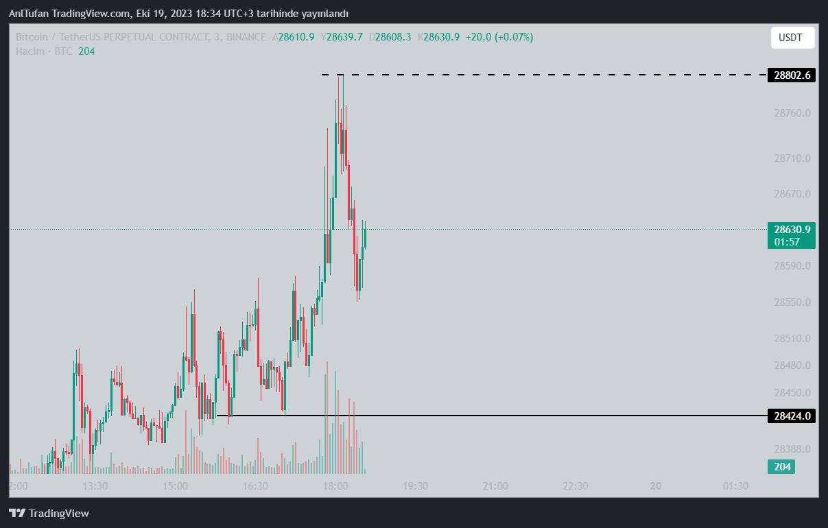 Lider kripto para birimi Bitcoin (BTC) son dakikalarda 28.400 dolardan 28.800 dolar seviyelerine kadar bir yükseliş yaşamış olsa da, ufak bir geri çekilme yaşayarak 28.600 dolara geriledi.