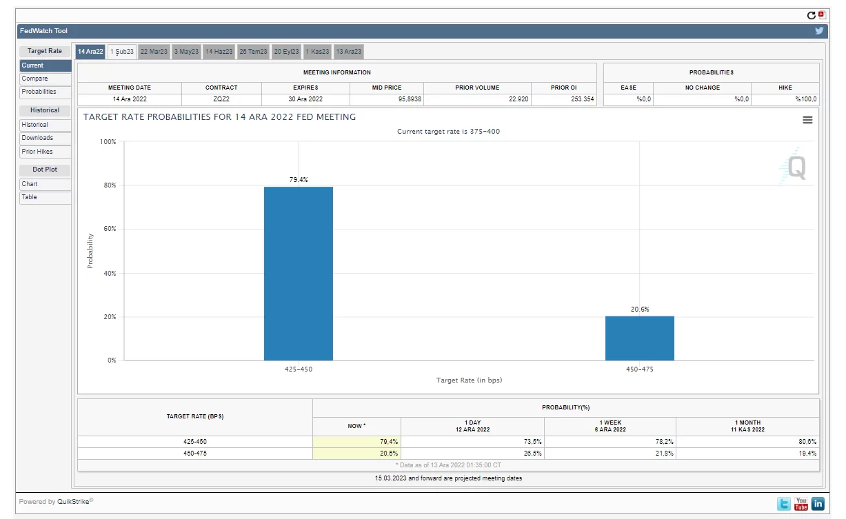 CME FedWatch’ın aktardıklarına göre, FED yarın itibariyle yüzde 79.4 ihtimalle 50 baz puanlık bir faiz artışı gerçekleştirecek. Son enflasyon verilerinin ardından 75 baz puanlık faiz artış ihtimali ise yüzde 20.6’ya gerilemiş durumda.