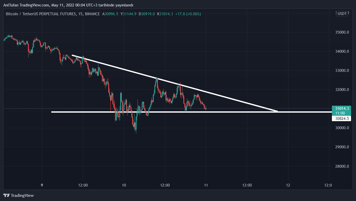 15 dakikalık grafikte bir bearish patern olarak adlandırılan alçalan üçgen formasyonu oluşturan lider kripto para, ilerleyen saatlerde 30.800 doları kaybetmesi halinde tekrar bir düşüşe başlayabilir.
