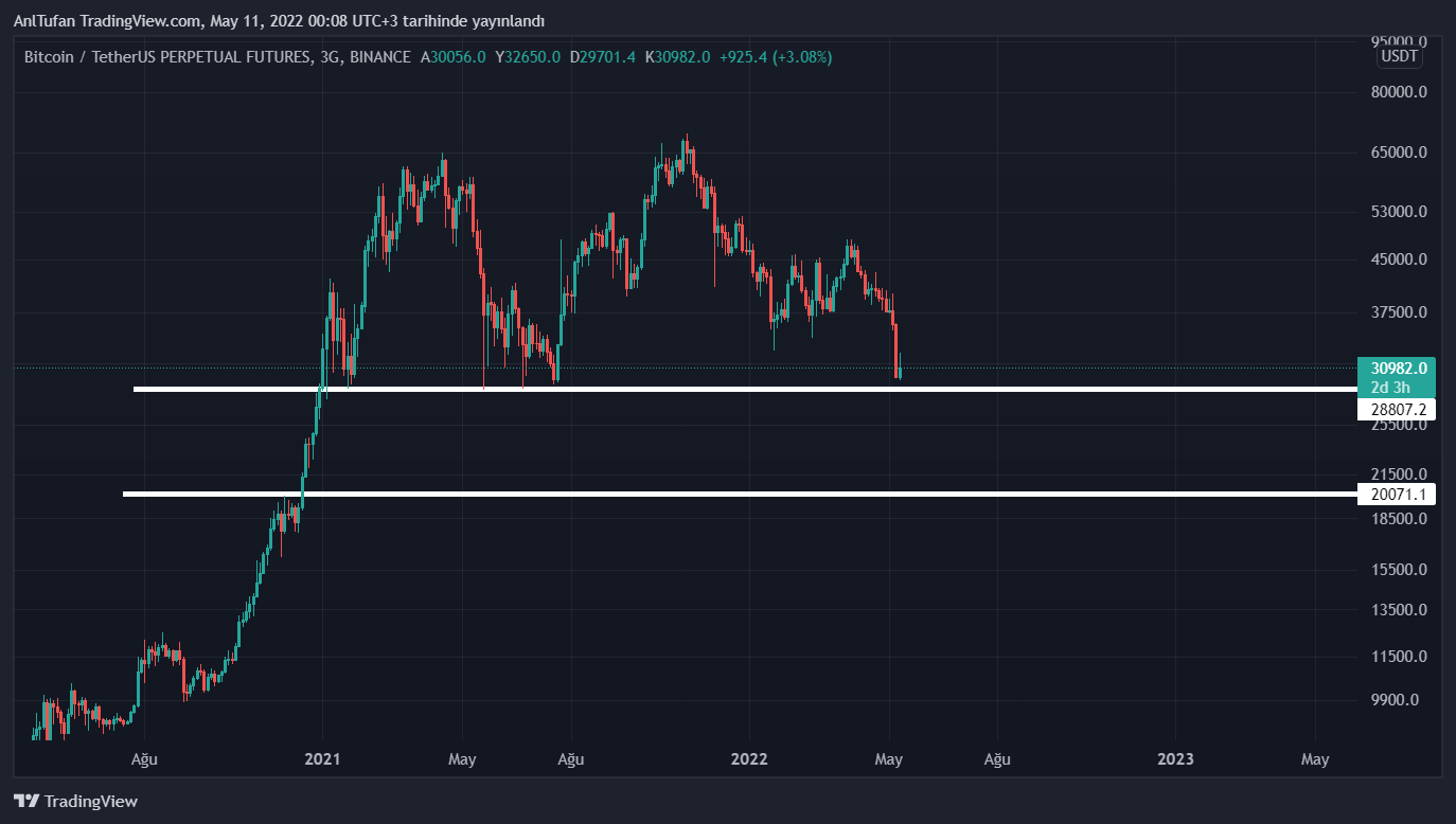 Geçtiğimiz aylarda birçok kez denediği 28.800 dolar seviyelerine halen bir iğne dahi atmamış olan BTC, bu seviyenin altına sarkarak bir likidasyon operasyonu gerçekleştirebilir.