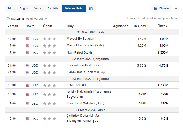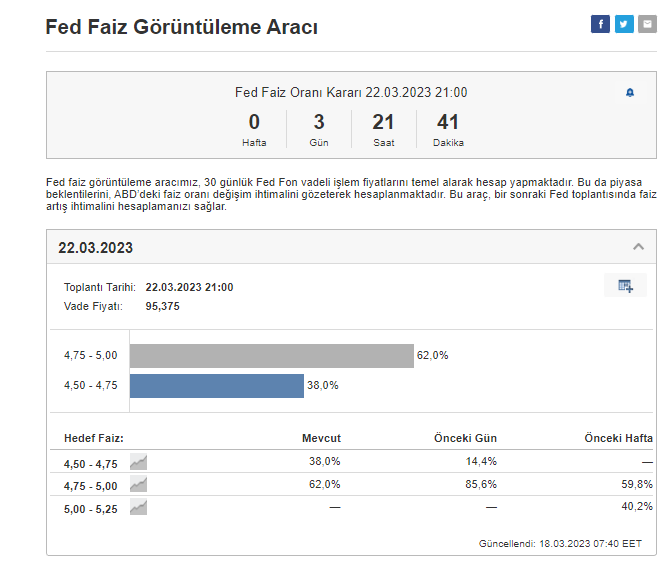 Piyasanın yüzde 38’lik kısmı ise önümüzdeki toplantıda FED’in faizleri artırmayacağını düşünüyor. Her ne kadar bankacılık krizi FED’in piyasaya para pompalamasını sağlamış olsa da, faiz artışlarının durması düşük bir ihtimal olarak görülmekte.