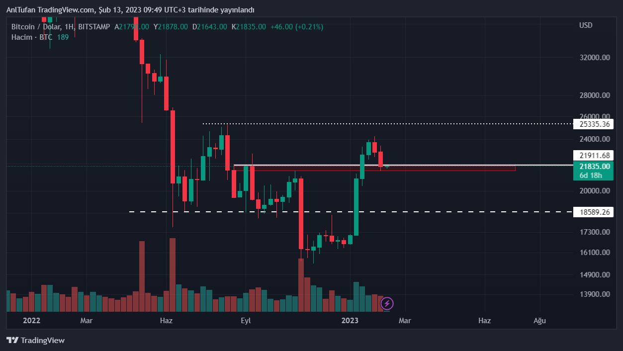 Bu düşüşler sonrasında TSİ 03.00’da lider kripto para birimi Bitcoin haftalık kapanışını gerçekleştirdi. Her ne kadar BTC 21.911 doların altında bir hafta kapatsa da, şimdilik destek seviyesinin kırıldığını söylemek güç.