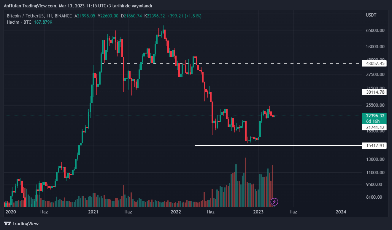 Lider kripto para biriminin haftalık kapanışı 21.740 doların üzerinde yapması, haftalık grafikteki yükseliş trendinin bozulmamasını sağladı. BTC şuan itibariyle yükselen dipler yapmaya devam ediyor.