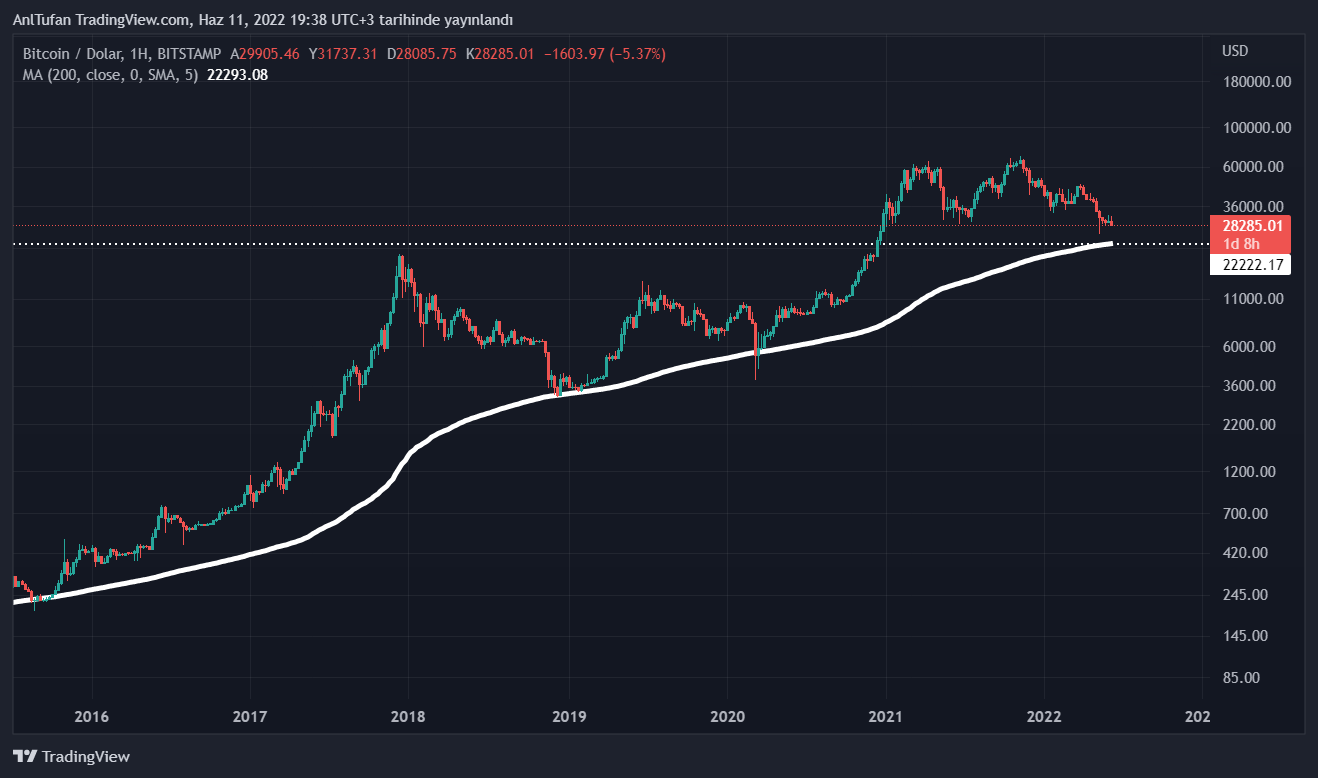 Düşüşlerin son bulacağı seviyeyi zaman gösterecek olsa da, Bitcoin‘in her ayı döneminde 200 haftalık hareketli ortalamadan dönüş yaşaması, lider kripto paranın bu seviyeleri denemesini çok olası kılmakta.