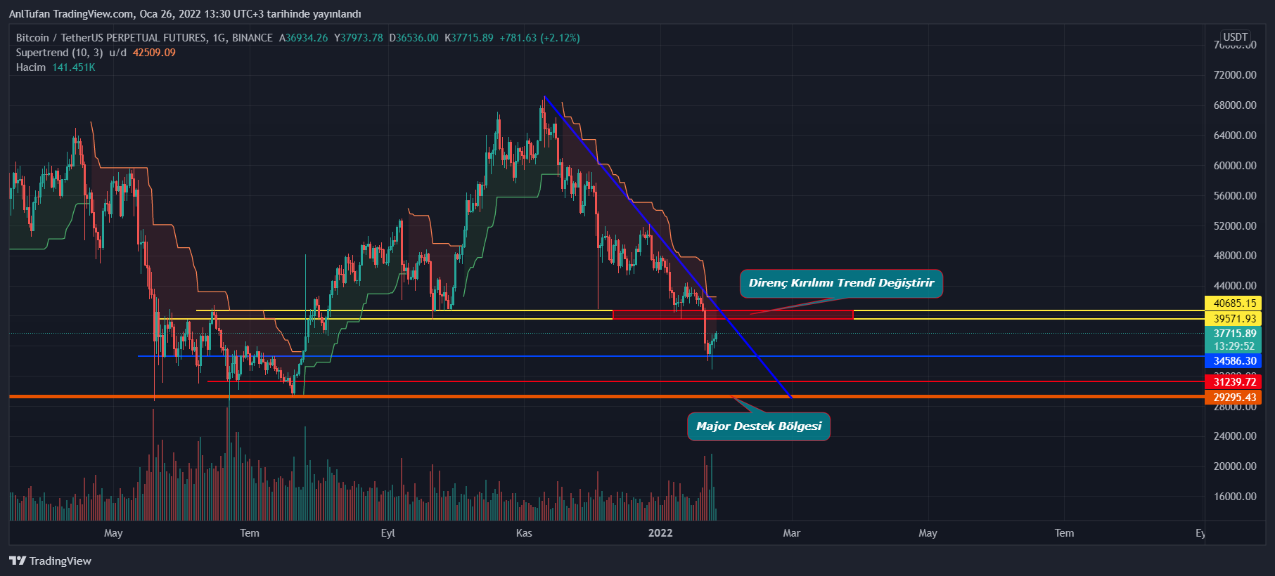 Bitcoin’in günlük grafikte major bir destek bölgesi olarak kabul ettiğimiz 39.500 – 40.500 dolar bölgesi, şuan ise major bir direnç bölgesi olarak karşımıza çıkabilir. Bu bölgenin kırılımıyla düşen trendini deneyecek olan Bitcoin’de, düşen trendinde kırılımı bizi tekrar boğa piyasasına sokabilir.