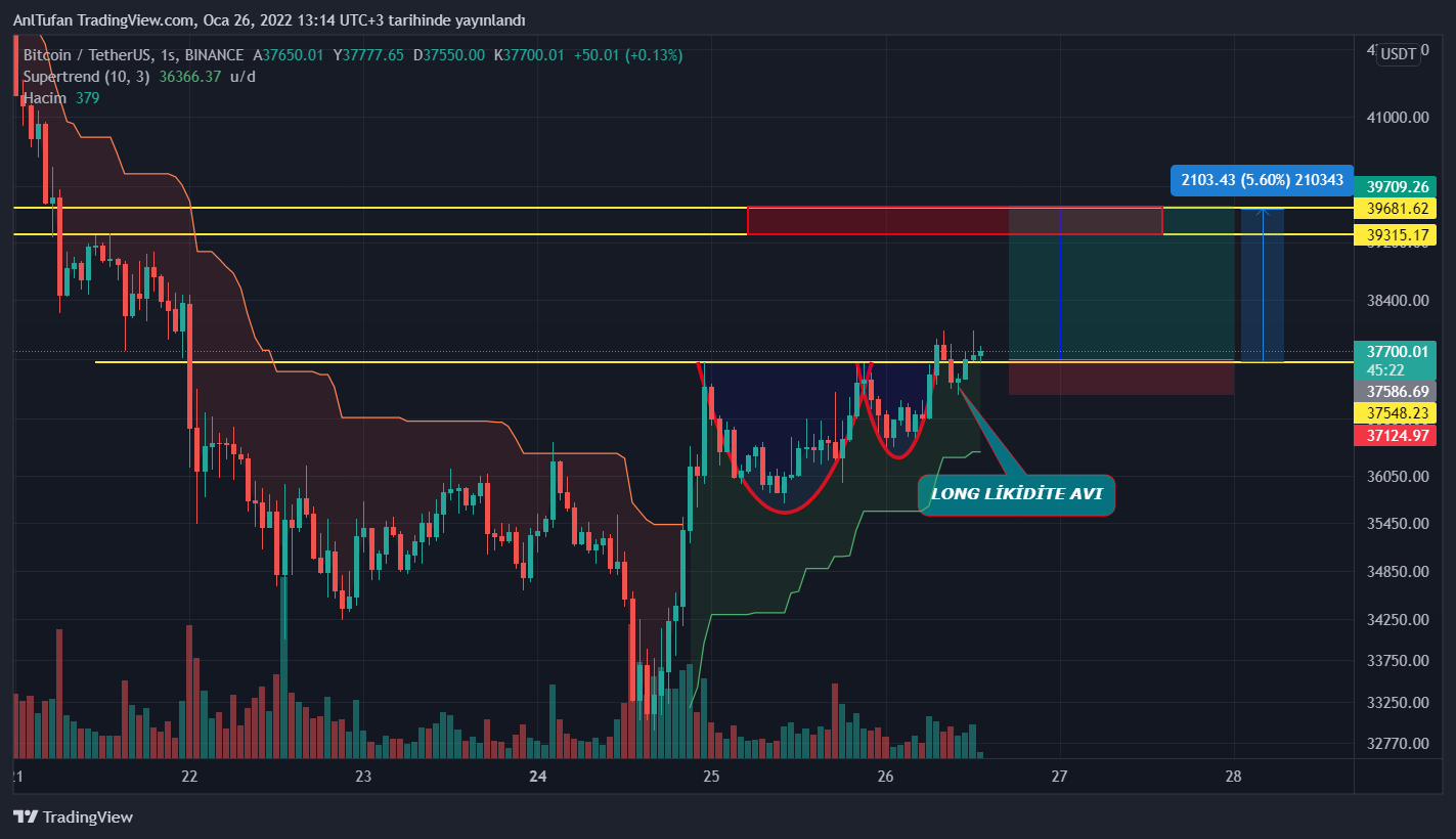 Yayın saati itibariyle 37.800 dolar seviyelerinde bulunan Bitcoin, saatlik grafikte oluşturmuş olduğu fincan – kulp formasyonunu yukarı yönlü kırmayı başardı. 37.800 dolar seviyesinde bulunan direncinin kırılımasının ardından gerekli yükselmeyi başaramayan BTC, formasyona güvenerek long işlem giren kaldıraçlı yatırımcıları likit etme yolunu tercih etti.