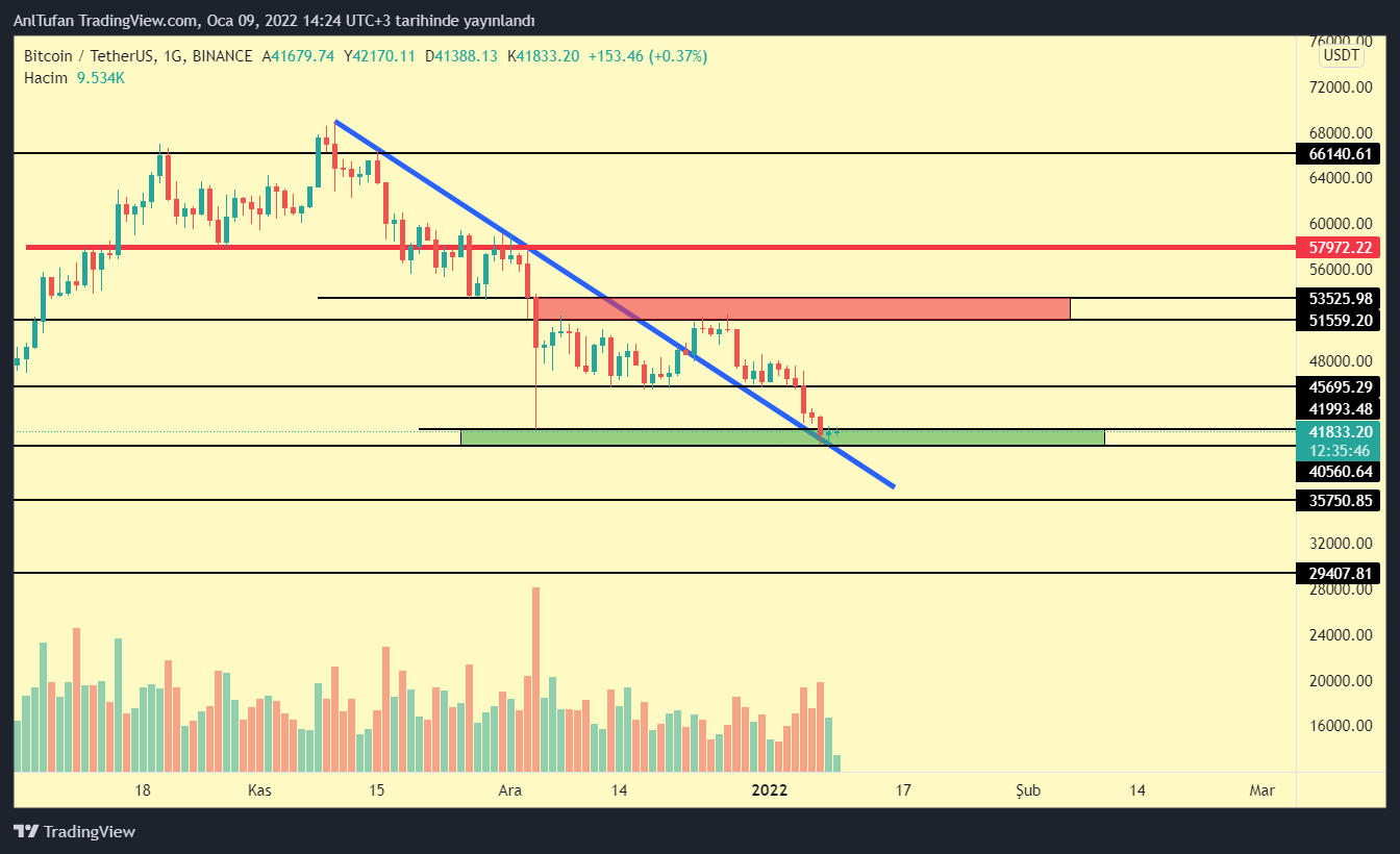 Yayın saati itibariyle 41.850 dolar seviyelerinde bulunan Bitcoin, günlük düşen trendini kırmasının ardından hala trend üstünde konumlanmaya devam ediyor. Her ne kadar trendin altına iğne atıp trend çizgisini zedelese de, kapanış çizgi üzerinde gelmişti.