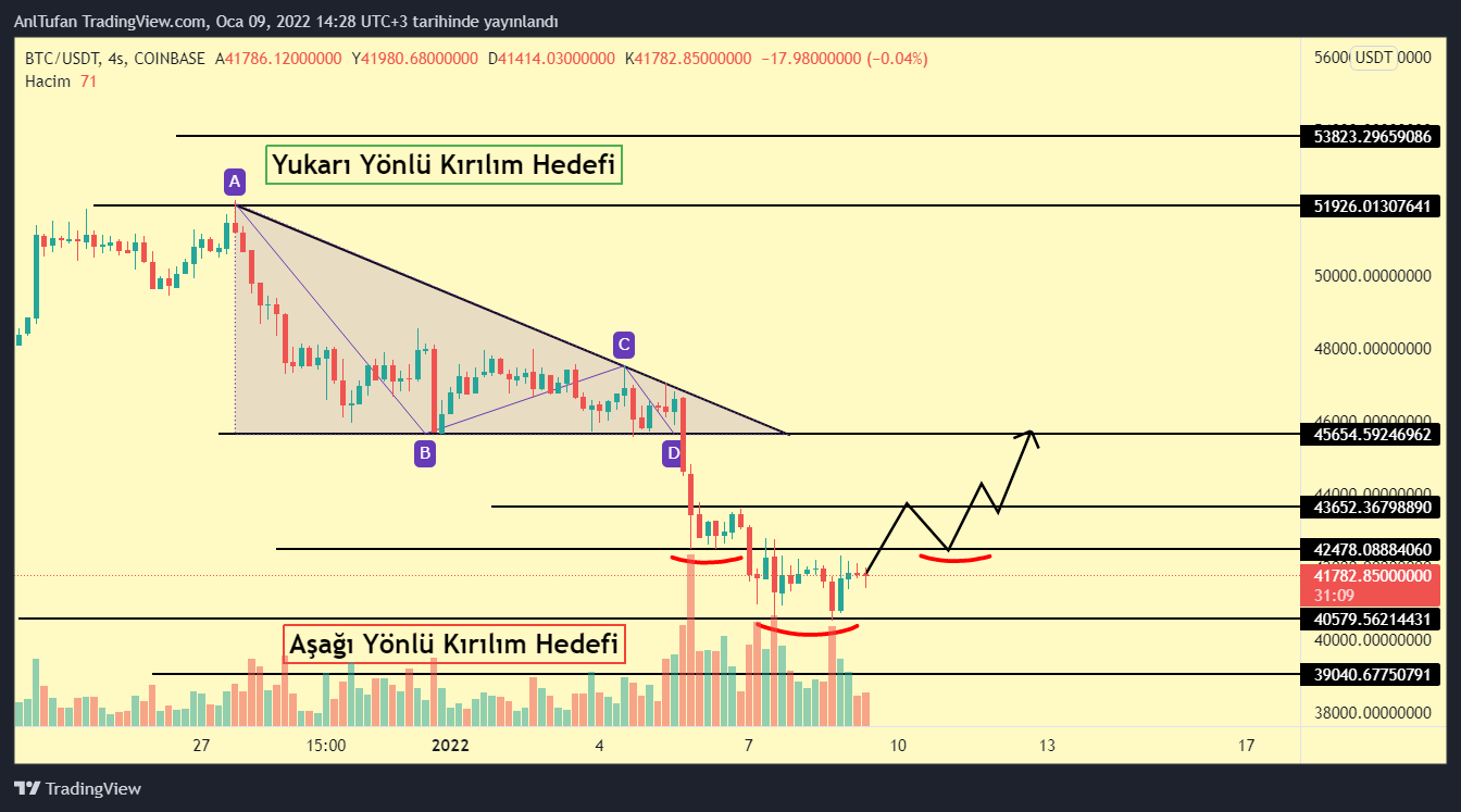 Bu yükselişin ardından bir reddedilme yiyerek 43.650 dolar direncinden 42.500 dolar desteğine kadar gerileyebilecek olan Bitcoin, bu seviyelerde güzel hacimli alımlar gelmesiyle tekrar TOBO formasyonun kırılım noktası olan 43.650 dolar direncine yükselecektir.