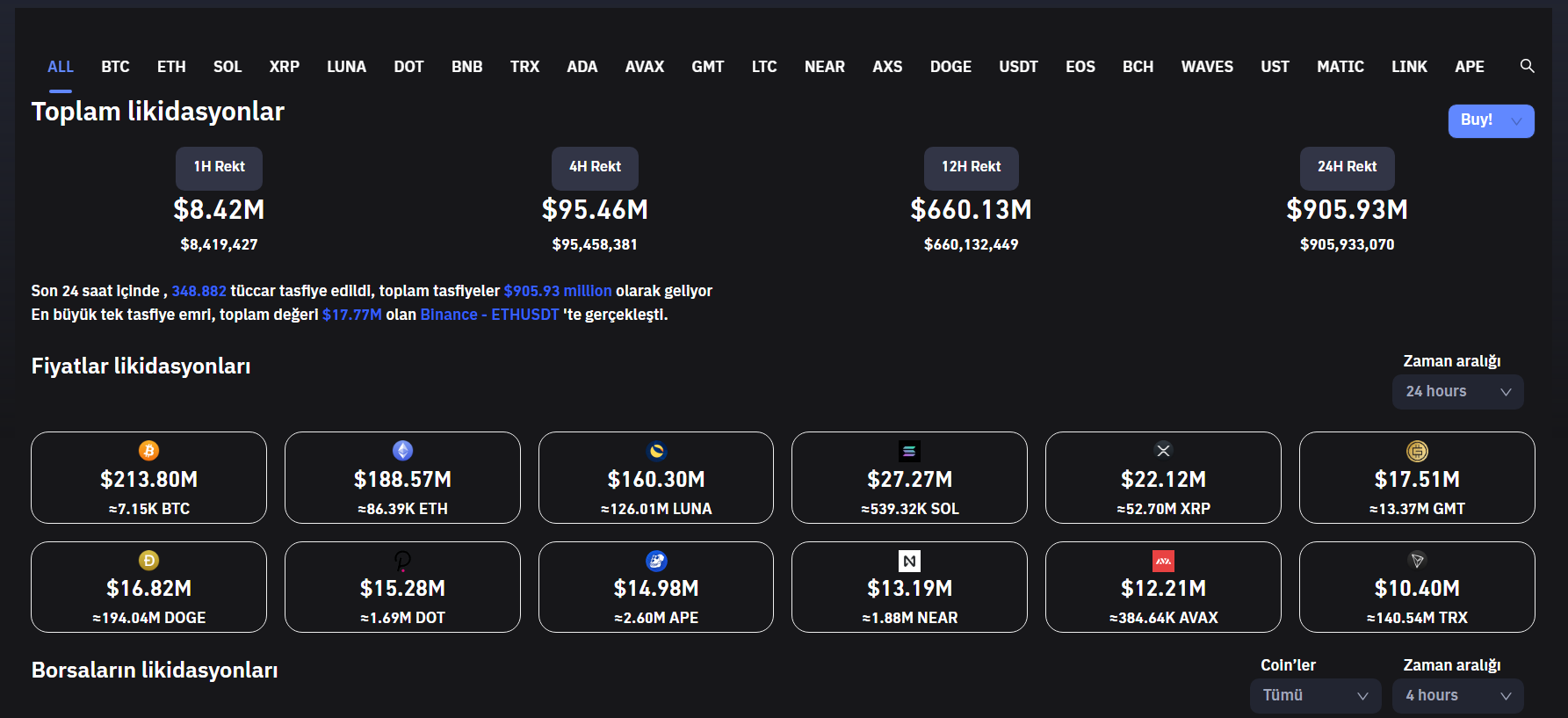 CoinGlass’ın aktardığı verilere göre, bugün itibariyle kripto piyasasında 905 milyon dolarlık pozisyon likit edildi.