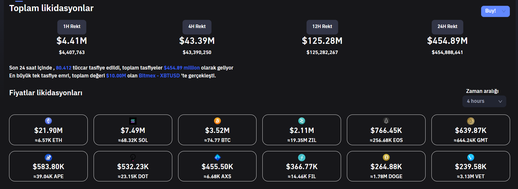 Dün gece itibariyle kripto piyasasında 454 milyon dolarlık likidasyon işlemi gerçekleşirken, bu likidasyonun çoğunluğunun Ethereum özelinde geldiği görülmekte.