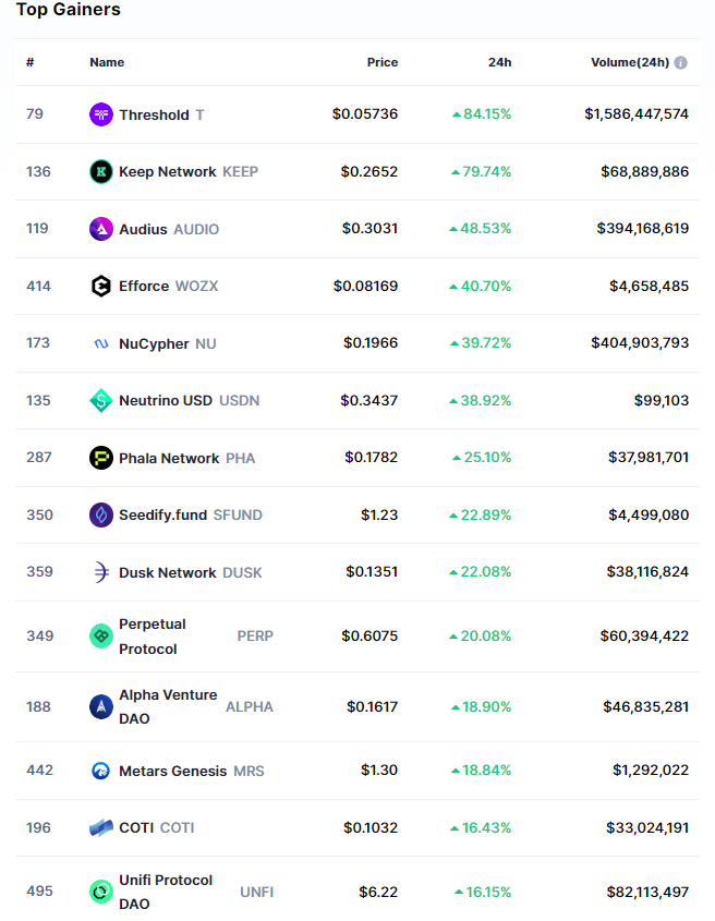 Başarılı bir veri sağlayıcısı olan CoinMarketCap’in aktardıklarına göre, bugün itibariyle en fazla yükselişi Threshold (T) isimli altcoin yaşadı. Son 24 saat içerisinde ilk 500 kripto para arasında yüzde 80’dan fazla değer kazanan T, yatırımcıların dikkatini çekmiş durumda.