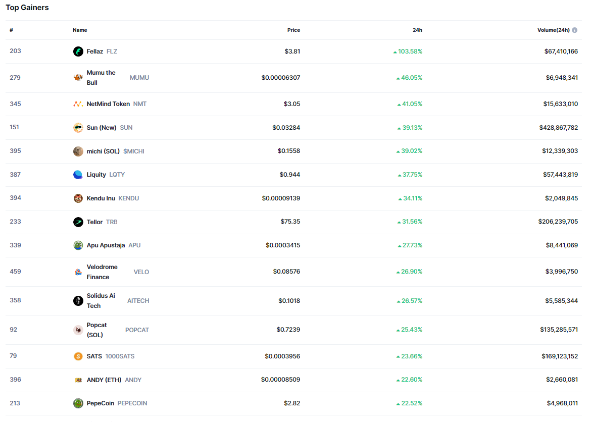 Başarılı veri sağlayıcısı CoinMarketCap’in aktardıklarına göre ilk 500 kripto para birimi içerisinde son 24 saat özelinde en çok artışı %103 ile birlikte FLZ isimli altcoin gerçekleştirdi.