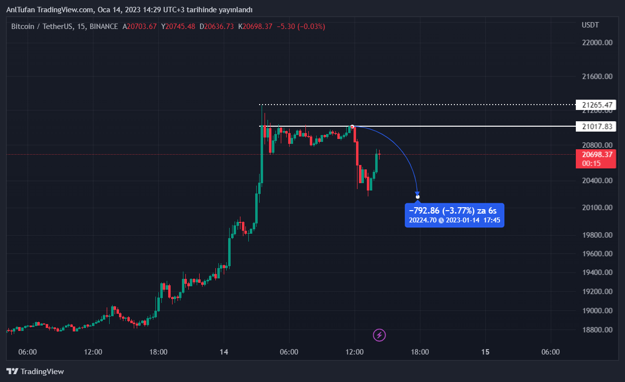 Bitcoin her ne kadar 21.250 dolar direncine kadar yükselmiş olsa da, 21 bin doların üzerinde 15 dakikalık kapanış dahi yapamadı. Ayıların bu seviyede sert bir satıcı baskısı oluşturması, BTC’de kısa sürede yüzde 4’e yakın bir düşüş getirdi.