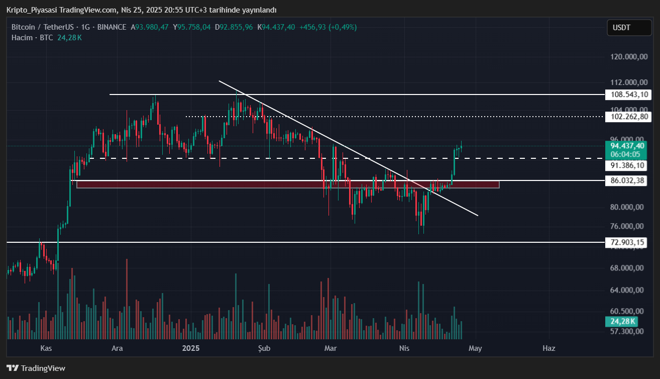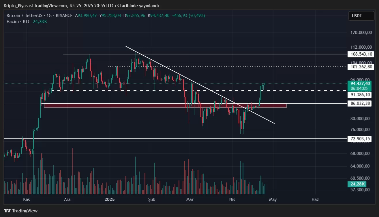 Lider kripto para birimi Bitcoin (BTC) haberimizin yazıldığı esnada 94.500 dolar seviyelerinden işlem görüyor. Kısa süre önce 91.386 major direnç seviyesini kırmayı başaran Bitcoin, şuan itibariyle gözünü ara direnç seviyesi olan 102.2062 dolara çevirdi.