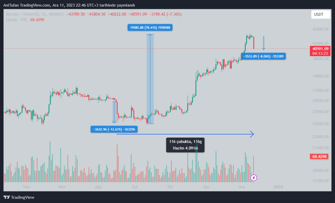 Lider kripto para birimi Bitcoin (BTC) en son %8’lik düşüşü 17 Ağustos 2023 tarihinde yaşamıştı. O tarihte BTC 28.800 dolardan 25.200 dolara gerilemişti.