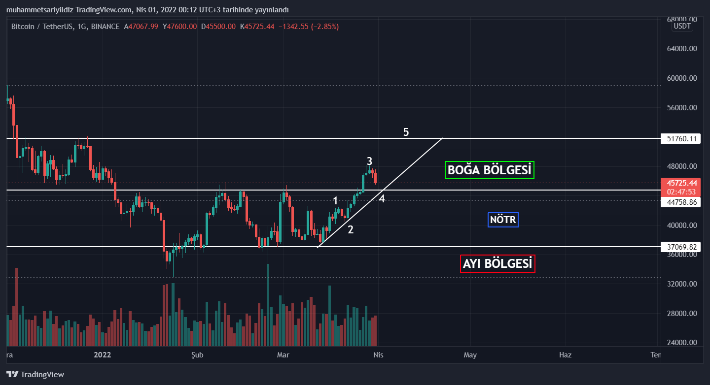 44.500 – 45.500 dolar bölgesinin üzerinde boğa sezonunda olacak olan BTC, bu seviyenin altına sarkmadığı takdirde elliot itki dalgaları teorimine göre 5. dalga olan 52.000 dolar seviyesine kadar yükseliş gerçekleştirmesi gerek.