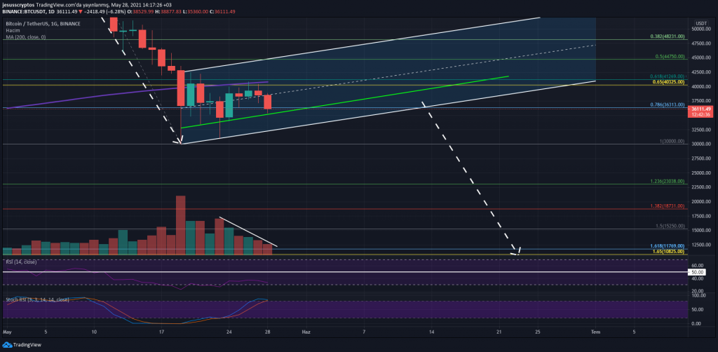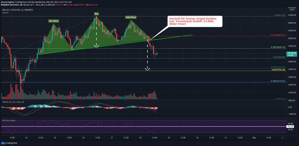 Ancak fiyat yükselişine devam eder ve boyun çizgisi olarak belirtilen yeşil trend çizgisi üzerinde mum kapanışı yaparsa veya 36.700 dolar üzerinde kapanışlarla yatay bir seyir izlerse, formasyonun bozulduğundan bahsedebiliriz.