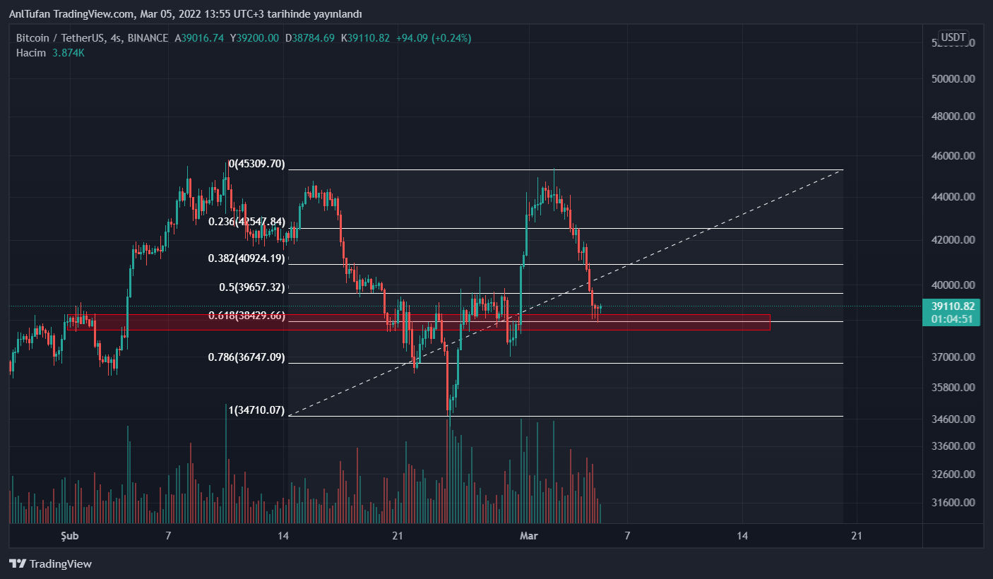 38.400 dolarda bulunan bu fibonacci seviyesinde nokta atışı yukarı doğru hareket eden BTC, 39.000 – 38.000 dolar aralığında bulunan destek seviyesinin hemen üzerinde konumlanmaya devam ediyor.