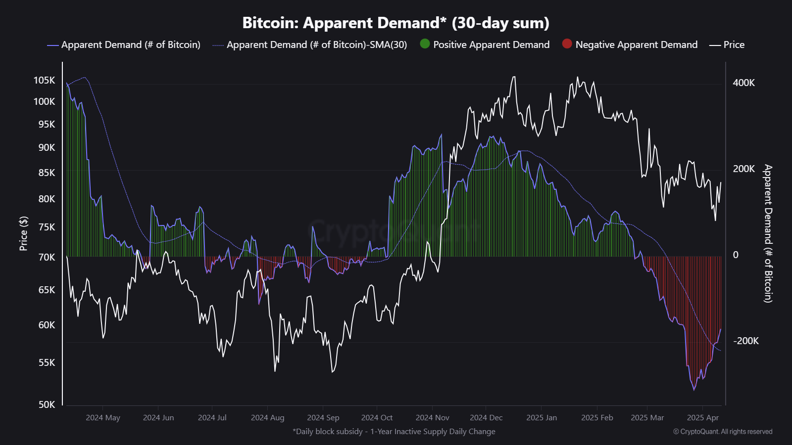 Bitcoin’in Görünür Talebi (30 günlük toplam) yakın zamanda derin negatif seviyelerden toparlanmaya başladı. Bu durum, piyasa davranışlarında olası bir değişime işaret ediyor olabilir. Ancak bunu yeni bir yükseliş döngüsünün başlangıcı olarak yorumlamak için henüz erken.