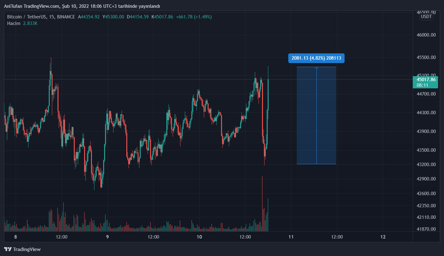 An itibariyle Bitcoin tekrardan 44.800 doların üzerine çıkarken, %4’e yakın bir yükseliş yaşadı. Geçtiğimiz saatlerde long işlemler likit olurken bu sefer düşüş geliyor diye açılan short işlemler likit olmuş durumda.