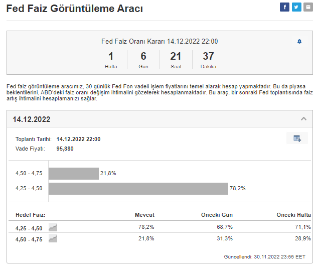 Her ne kadar FED’in aralık ayında yine 75 baz puanlık faiz artışı gerçekleştirme ihtimali var olsa da, bu oranın yüzde 22 kadar küçük olduğu görülebiliyor.