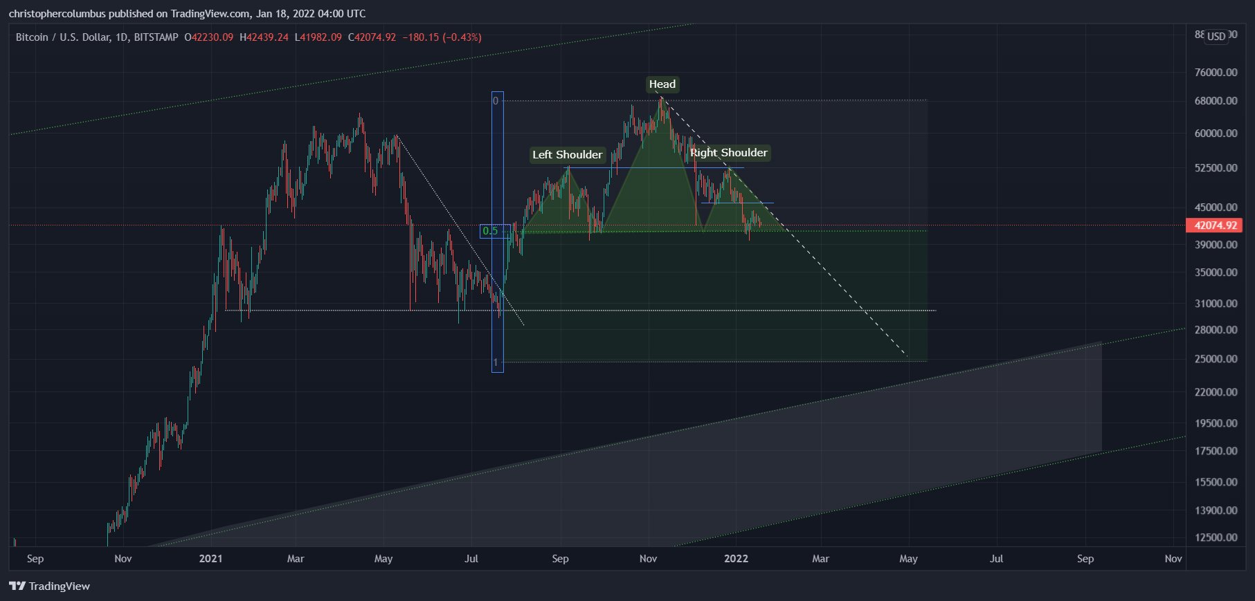 Dave the Wave, Bitcoin’in olası bir aşağı yönlü hareketinde, 25.000 dolar seviyesine kadar düşmesi ihtimaline fibonacci ölçümlerinden ulaşıyor ve baş ve omuz modelini tanımlıyor.