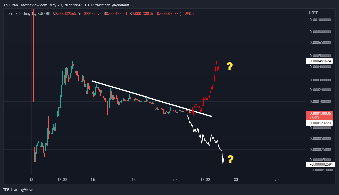 İlerleyen saatlerde düşen trendini kırması halinde grafik üzerinde bulunan kırmızı çizgi gibi bir hareket sergilemesini beklediğimiz LUNA, yatay destek seviyesini kaybetmesi halinde ise beyaz çizgiler gibi düşüş yaşayabilir.