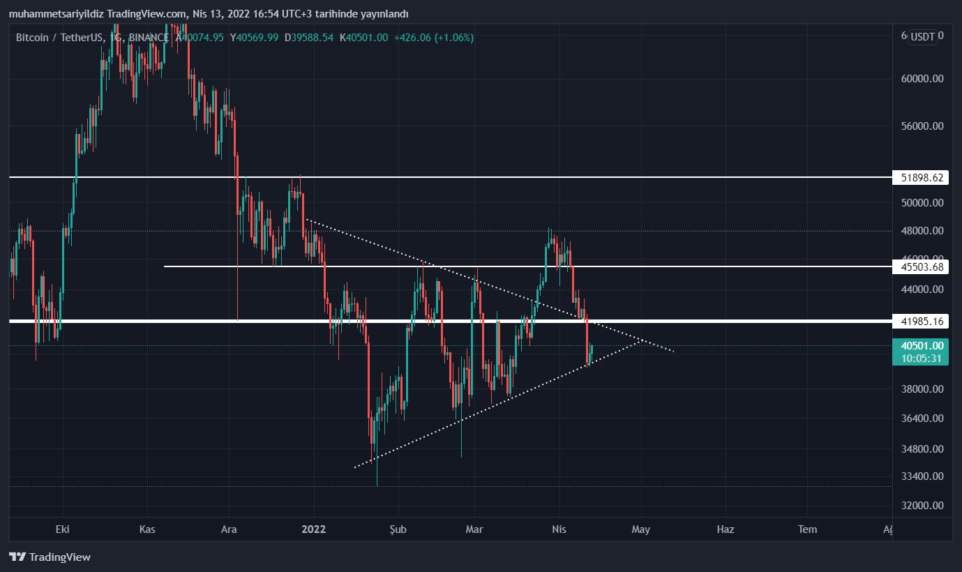 Yayın saati itibariyle 40.500 dolar seviyelerinde bulunan Bitcoin, geçtiğimiz günlerde yaşanan satış hareketleriyle birlikte tekrardan simetrik üçgen formasyonunun içine girdi.