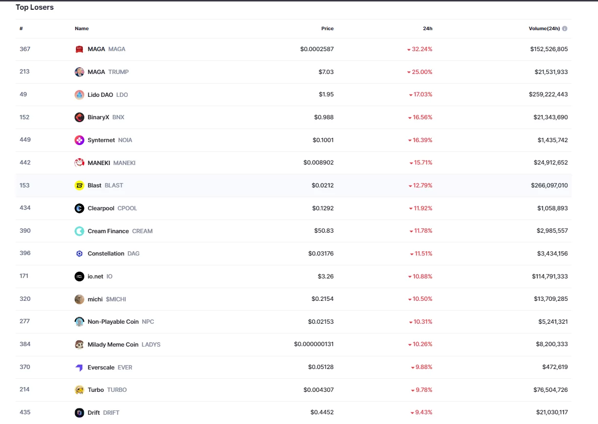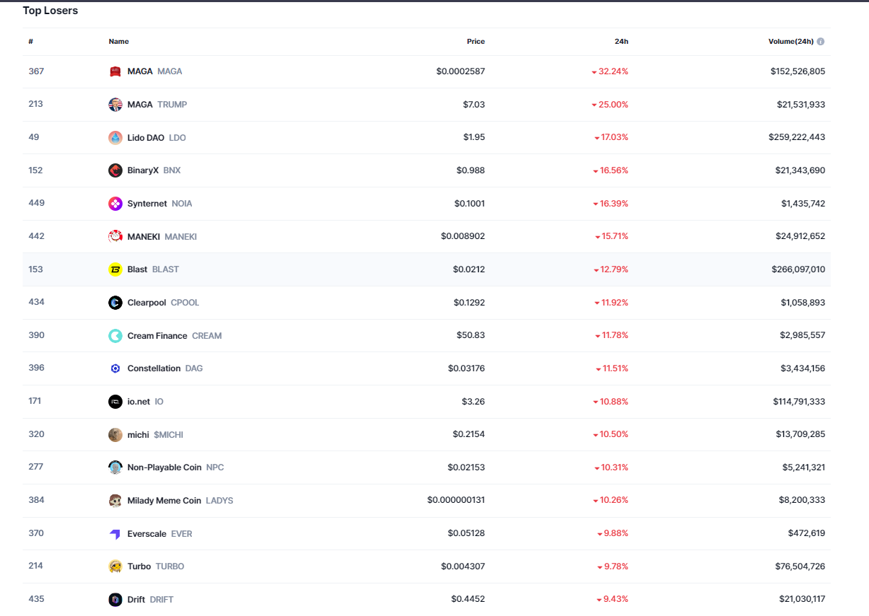 Başarılı veri sağlayıcısı CoinMarketCap’in aktardıklarına göre ilk 500 kripto para birimi içerisinde son 24 saat özelinde en çok düşüşü MAGA isimli altcoin gerçekleştirdi.
