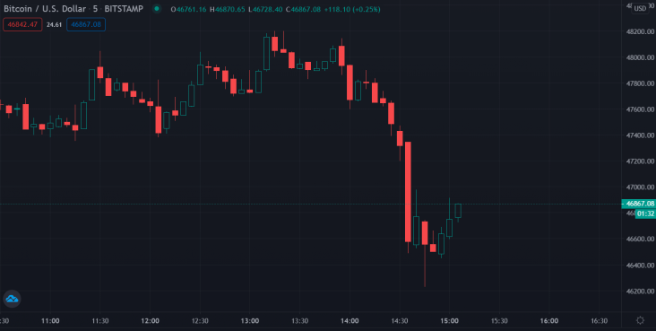 Bitstamp kripto para borsası üzerindeki BTC grafiğine bakıldığında fiyatın 48.000 dolar bandından birkaç mum ile 46.600 dolara kadar gerilediği görülebiliyor. Bu esnada açık olan binlerce long pozisyon ise ya tasfiye oldu ya da tasfiye olma sınırına geldi.
