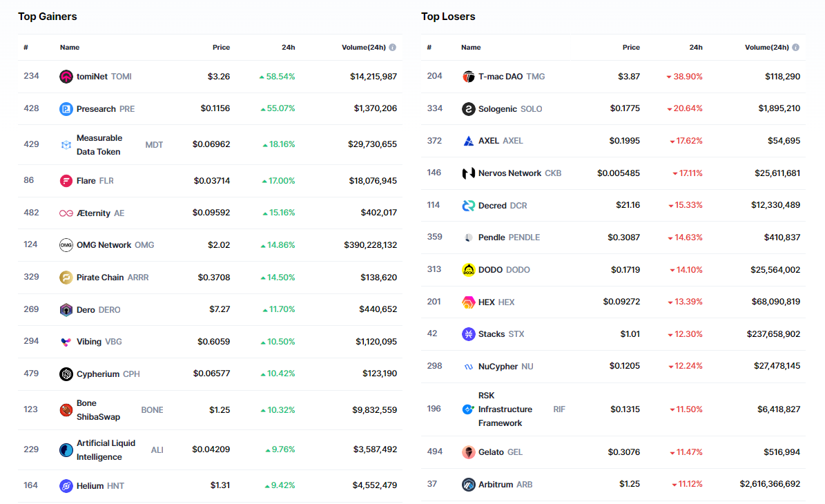 Başarılı bir veri sağlayıcısı olan CoinMarketCap’in aktardıklarına göre, son 24 saat içerisinde ilk 500 kripto para birimi içerisinde en büyük yükselişi tomiNet (TOMI) isimli altcoin yaşadı.