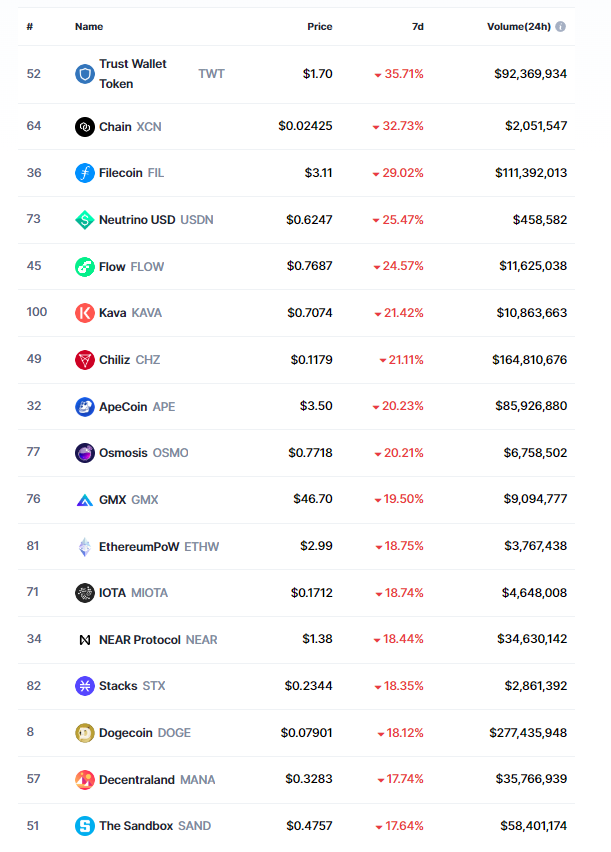 Geçtiğimiz haftalarda yukarı yönlü hareketler sergileyen TWT, bu hafta yatırımcılarının zarar etmesine neden oldu. TWT’nin haricinde ise aşağıda yer alan altcoin’ler, bu hafta özelinde yüzde 20’den fazla düşüş yaşadı: