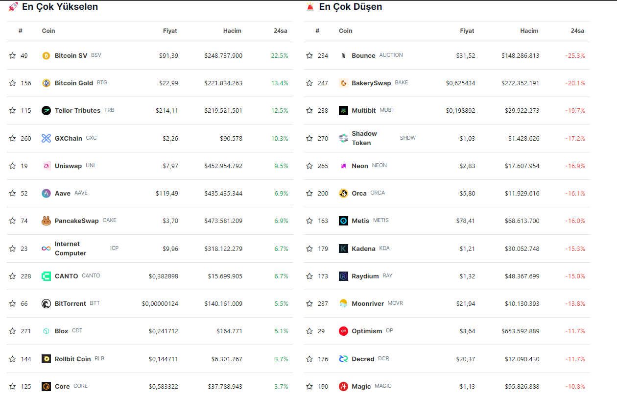 Hadi gelin bugünün en fazla yükselen ve düşen altcoin’lerine birlikte göz atalım: