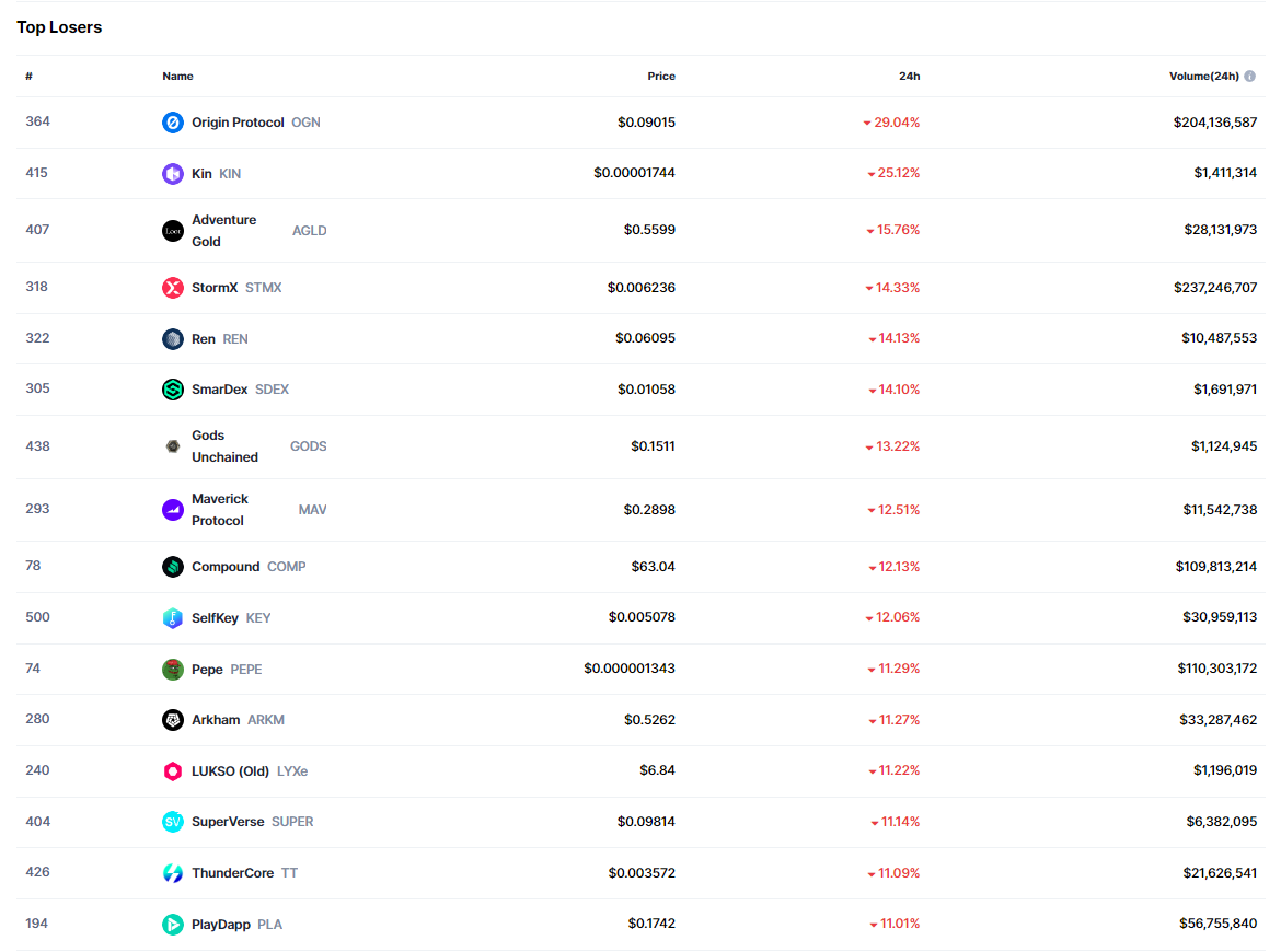 Bugün itibariyle yüzde 29 oranında düşüş yaşayan OGN, yatırımcılarının çok kötü bir gün geçirmesine neden oldu. OGN haricinde şu altcoin’lerin de bugün özelinde kayda değer düşüşler yaşadığı görüldü: