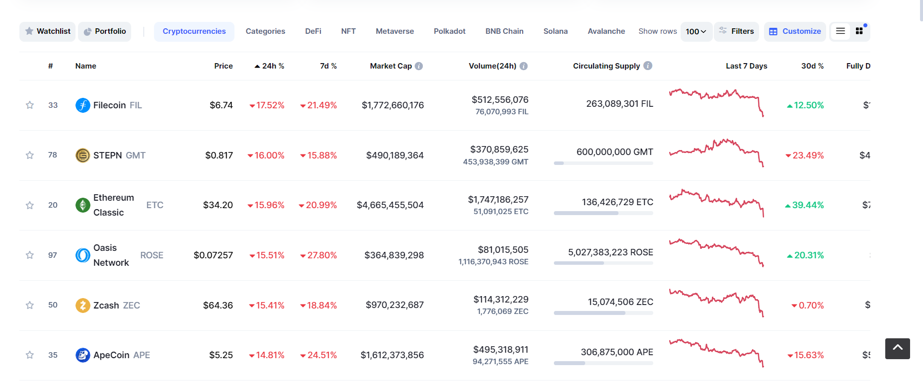 Başarılı bir veri sağlayıcısı olan CoinMarketCap‘in aktardıklarına göre, ilk 100 kripto para birimi içerisinde en fazla düşüş yaşayan Filecoin (FIL) oldu.