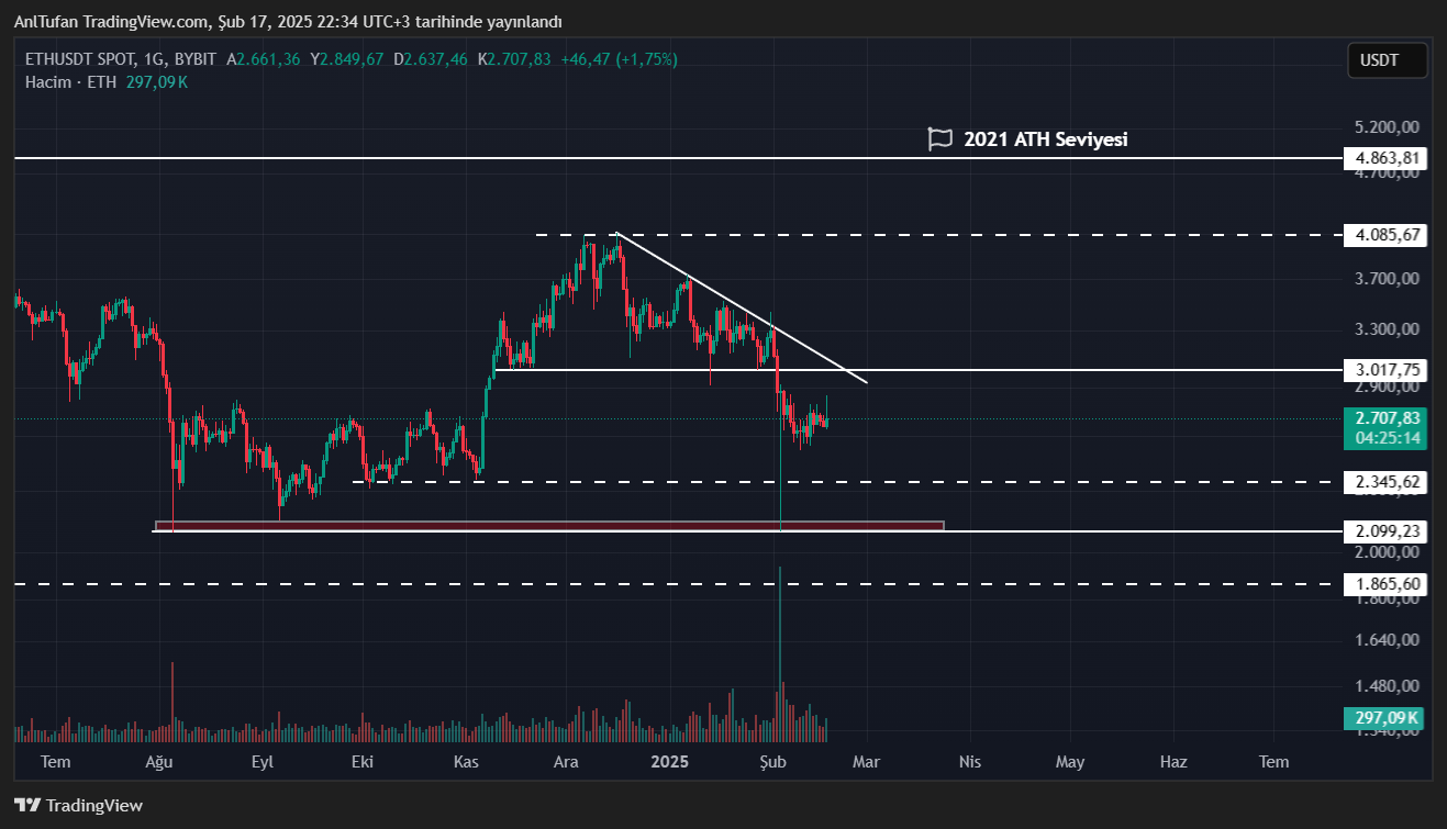 Bitcoin’in (BTC) 95 bin doları kaybetmesi 91 bin dolar desteğine kadar bir düşüş getirebileceği gibi böyle bir düşüş ETH fiyatının da tekrardan 2.500 dolar desteğine gerilemesine neden olabilir.
